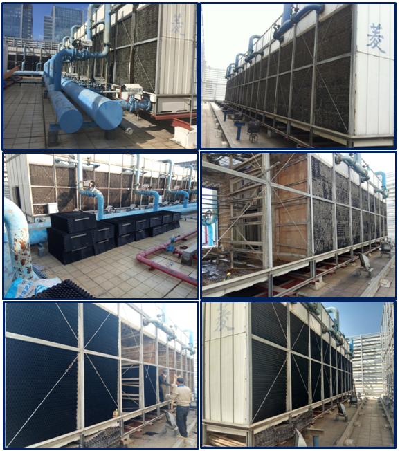 TCL總部大樓采購國內(nèi)知名品牌,冷卻塔總冷量為6000冷噸,原生產(chǎn)廠家已經(jīng)停止生產(chǎn)該款尺寸冷卻塔填料,管道多個部位均出現(xiàn)破裂漏水,我司排除專業(yè)技術(shù)團(tuán)隊(duì),在不停機(jī)狀況下完成整個升級改造,效果于新設(shè)備無異。